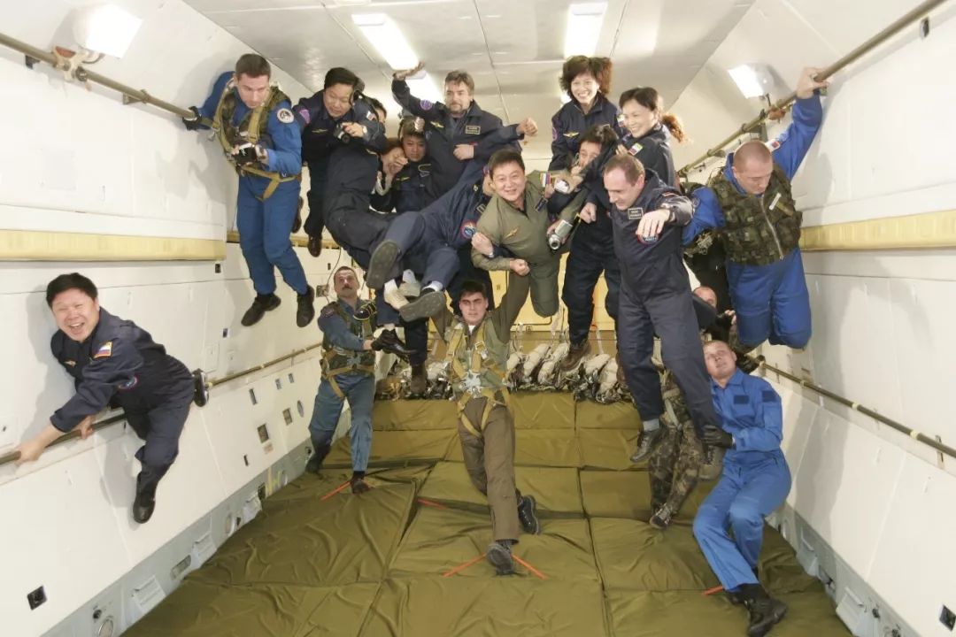 在俄羅斯首都莫斯科的加加林阿特拉斯宇航中心,10名中國(guó)游客在俄羅斯宇航員的保護(hù)下體驗(yàn)太空失重訓(xùn)練。(2004年12月17日,陳建力)