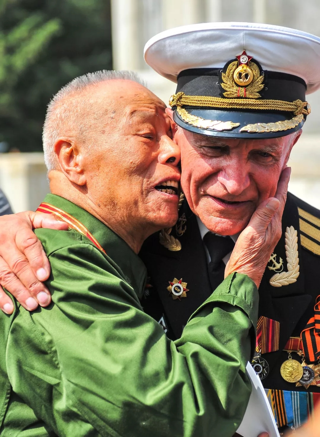 吉林長春,中俄雙方抗戰(zhàn)老戰(zhàn)士在祭奠蘇聯(lián)紅軍烈士活動(dòng)上相擁。(2015年9月2日,許暢)