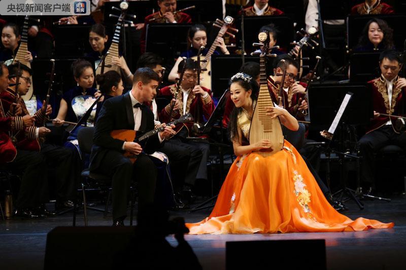△中國琵琶演奏家趙聰和俄羅斯音樂家尼古拉伊丘克在表演曲目《綻放》。文藝演出持續(xù)了一小時,有約120名中俄藝術家參演。