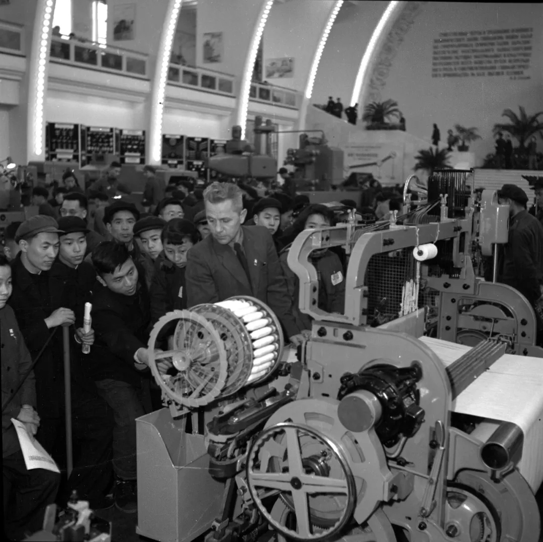 上海,觀眾在蘇聯(lián)經(jīng)濟(jì)及文化建設(shè)成就展覽會上參觀蘇聯(lián)制造的自動織布機(jī).(1955年3月15日,楊溥濤)