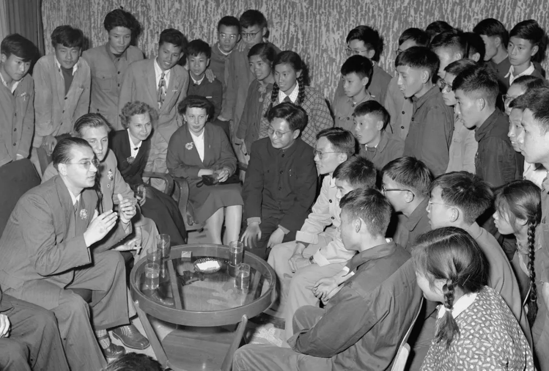 共青團員們在上海舉行聯(lián)歡會,慶祝十月革命40周年。這是上海學(xué)生和蘇聯(lián)青年代表保爾·沙柯夫等交談。(1957年11月5日,楊溥濤)