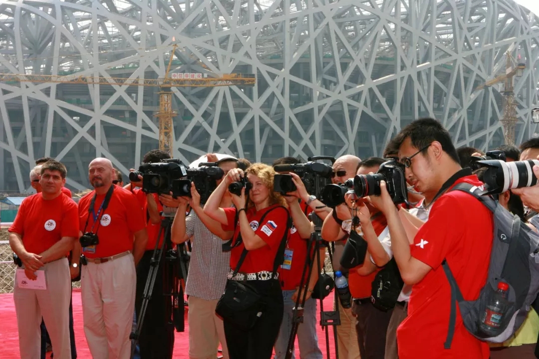 參加“中俄友誼之旅·中國(guó)行”報(bào)道組的中俄兩國(guó)媒體記者在北京奧體中心采訪。(2007年6月25日,李明放)