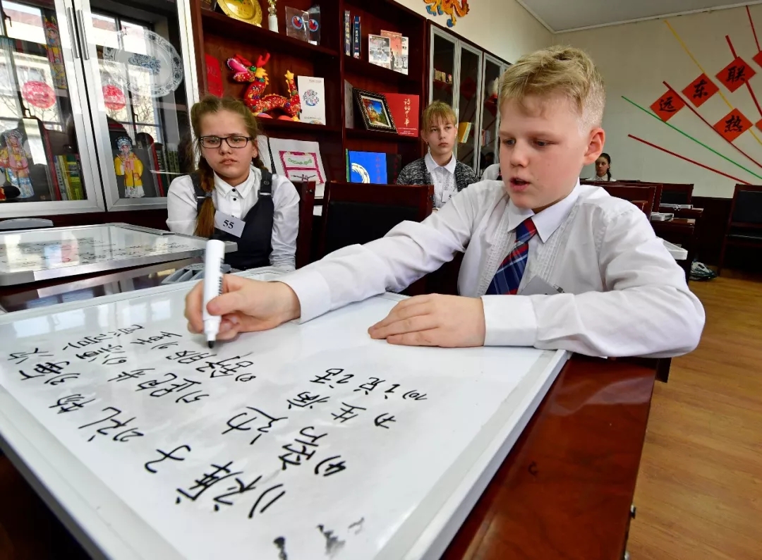 俄羅斯學生在符拉迪沃斯托克遠東聯(lián)邦大學孔子學院書寫漢字。(2017年,尤里·斯米秋克)