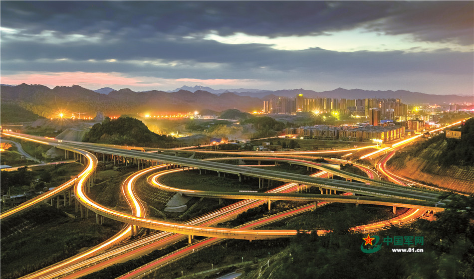 貴州省遵義縣龍坑立交橋由8座大橋組成,全長近12公里,為貴州最大的3層互通式立交橋,是連通杭瑞、蘭海高速的“大動脈”,這是龍坑立交橋夜景。唐正 攝