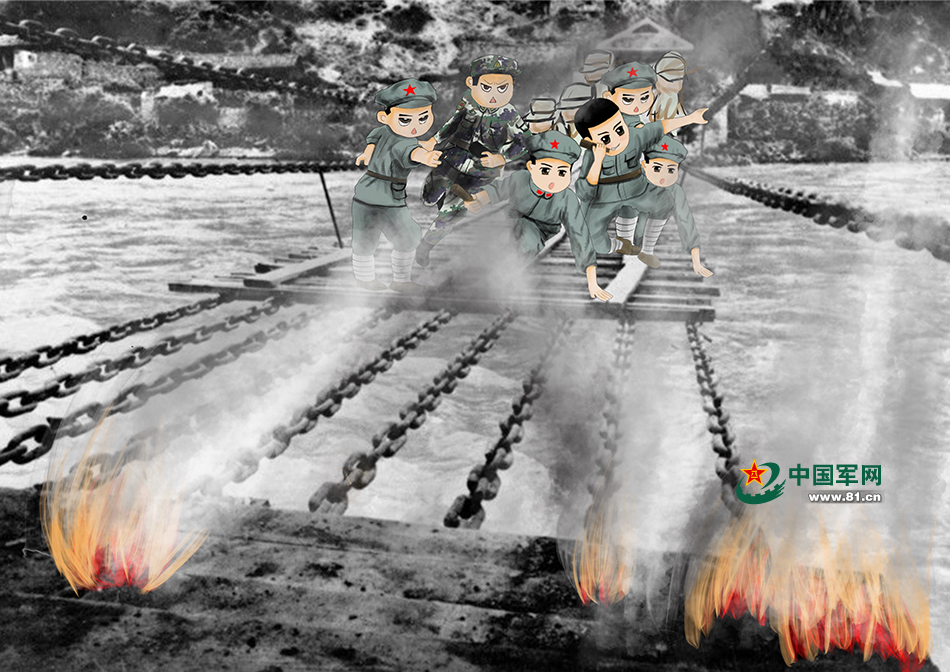 紅四團(tuán)官兵晝夜奔襲120公里到達(dá)瀘定橋西岸。橋面木板已被敵人拆走,橋下是洶涌咆哮的河水。突擊隊(duì)員冒著槍林彈雨,攀著鐵索,頑強(qiáng)地向河對岸爬去,身后的一個連一邊鋪木板一面跟進(jìn)。