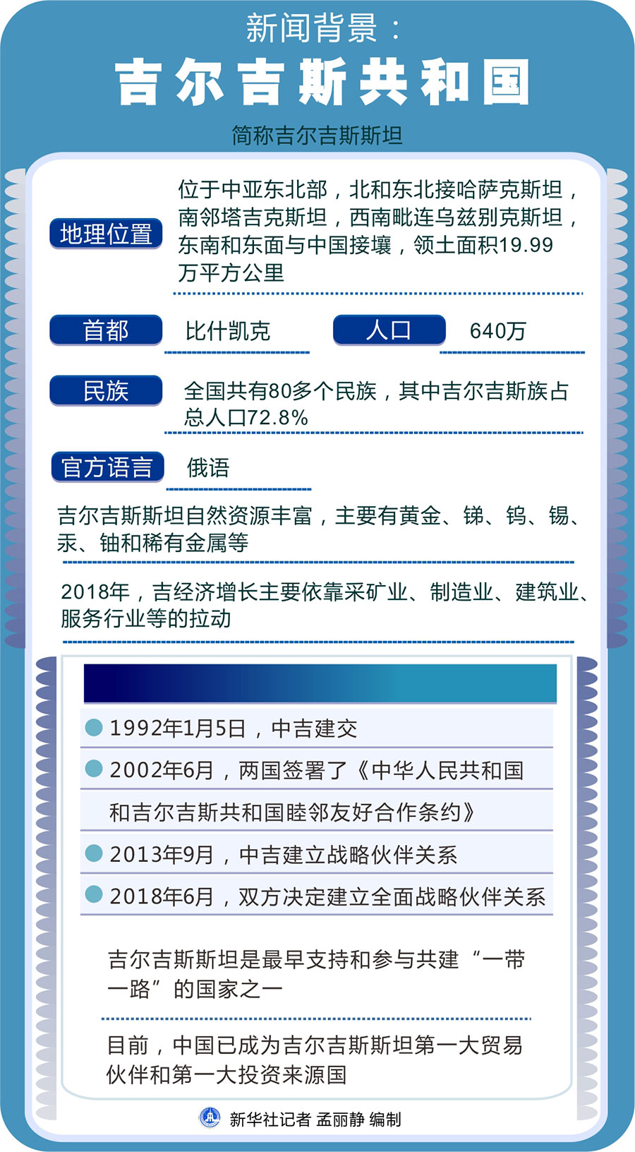 中吉兩國是山水相連的友好鄰邦,有著約1100公里的共同邊界。1992年1月5日,中吉建交。建交以來,兩國關(guān)系持續(xù)穩(wěn)定健康發(fā)展。2002年6月,兩國簽署了《中華人民共和國和吉爾吉斯共和國睦鄰友好合作條約》。2013年9月,中吉建立戰(zhàn)略伙伴關(guān)系。2018年6月,雙方?jīng)Q定建立全面戰(zhàn)略伙伴關(guān)系。