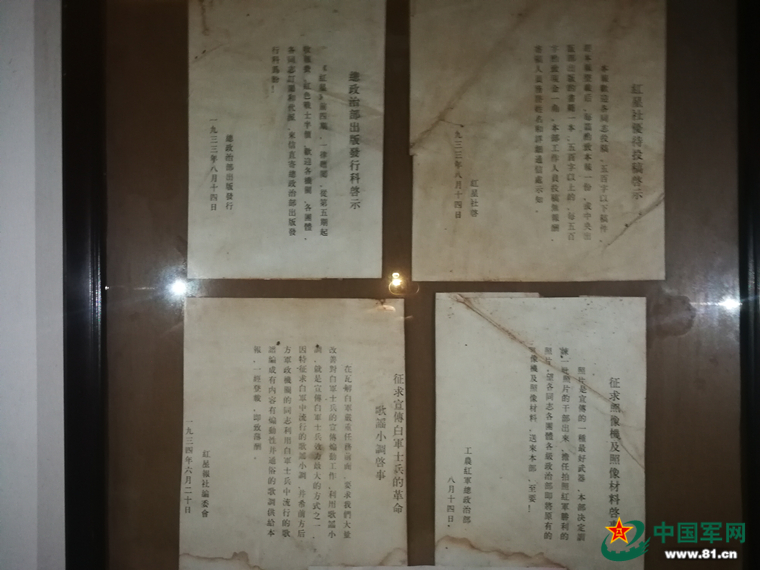 四份珍貴史料:總政治部出版發(fā)行科啟示(左上),紅星社優(yōu)待投稿啟示(右上),征求宣傳白軍士兵的革命歌謠小調(diào)啟事(左下),征求照相機(jī)及照相材料啟事(右下)。宋明亮 攝