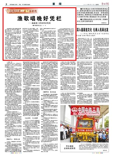 清晨,一面五星紅旗在永興島上空冉冉升起……全島軍民每周一都會(huì)集合在市政府廣場(chǎng)前舉行升國(guó)旗儀式。無(wú)論是島上的政府工作人員還是漁民,每個(gè)人的衣服上都繡著五星紅旗。一面小小的紅旗,見(jiàn)證著一代又一代三沙人保衛(wèi)南海、建設(shè)南海,用青春和熱血為國(guó)旗增輝的鏗鏘步履。請(qǐng)關(guān)注今日出版的《解放軍報(bào)》的詳細(xì)報(bào)道——