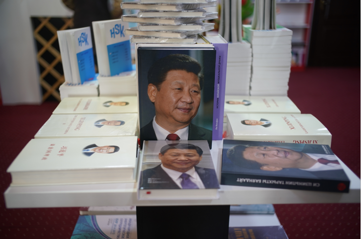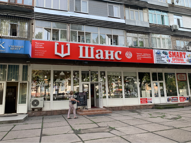 △比什凱克市中心的尚斯書店是中亞地區(qū)第一家中文主題書店。書店正中擺放的書籍是剛剛翻譯成吉爾吉斯語的《習近平談治國理政》和《習近平講故事》。(央視記者彭漢明拍攝)