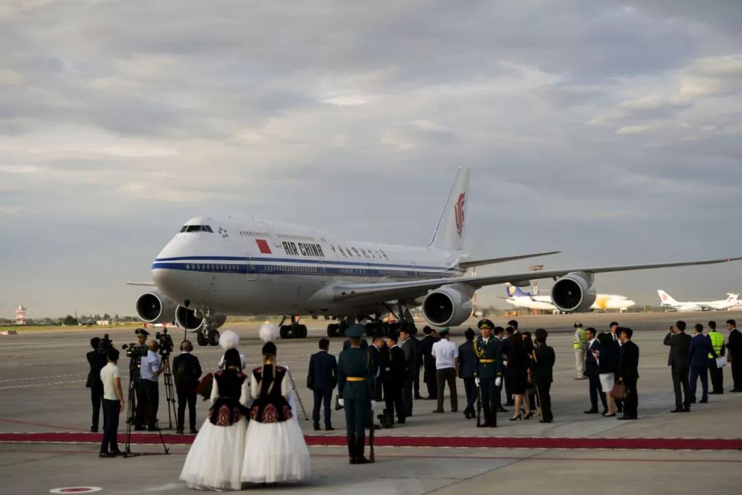習近平同前來迎接的吉爾吉斯斯坦總統(tǒng)熱恩別科夫親切交談。新華社記者 謝環(huán)馳 攝