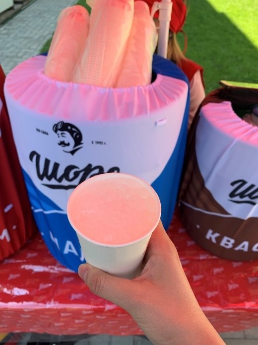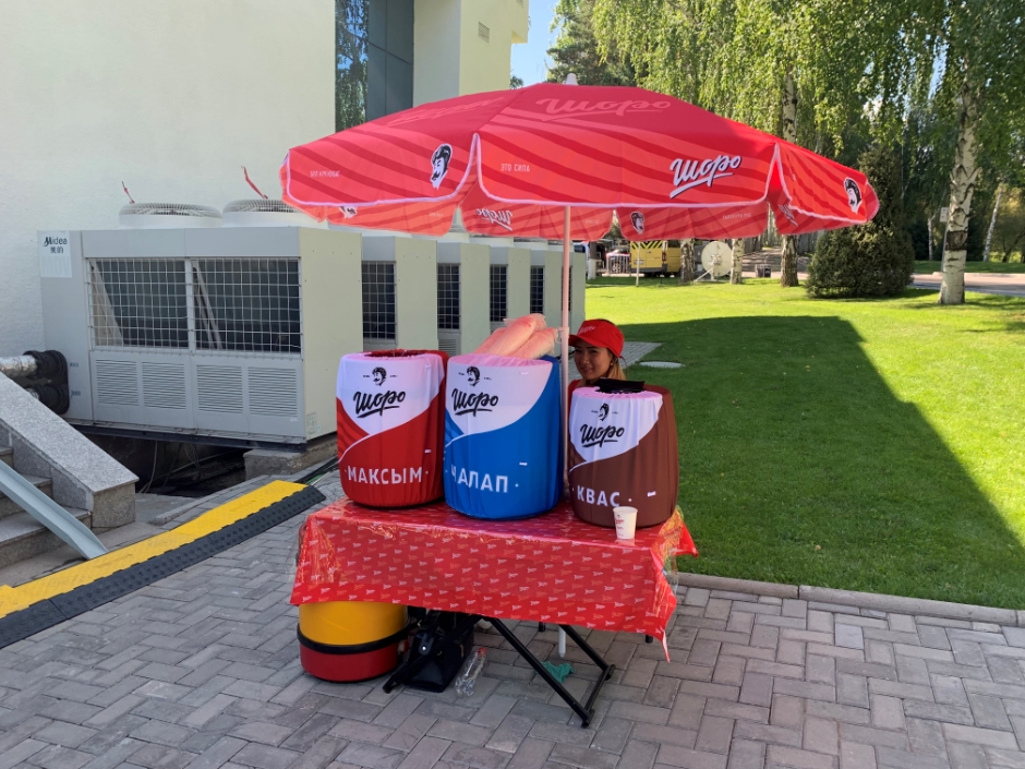 △工作人員把這樣的飲料攤搬到國賓館里,讓客人免費品嘗吉爾吉斯的“街飲”(馬克瑟姆、酸奶、格瓦斯)。熱情的吉國新聞官給《時政新聞眼》要了杯酸奶。