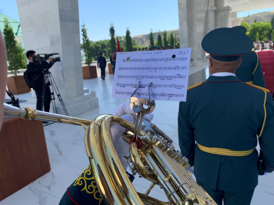 △軍樂團(tuán)列隊(duì)完畢。他們的樂器上夾著《義勇軍進(jìn)行曲》的樂譜,樂譜右上方還有中文標(biāo)注的詞曲作者。