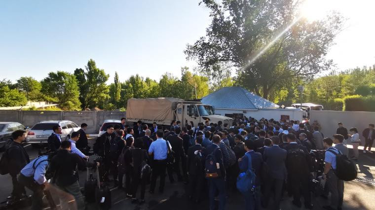 △清晨,報(bào)道上合峰會(huì)的記者正在等待進(jìn)入阿拉爾恰國賓館。(央視記者張曉鵬拍攝)