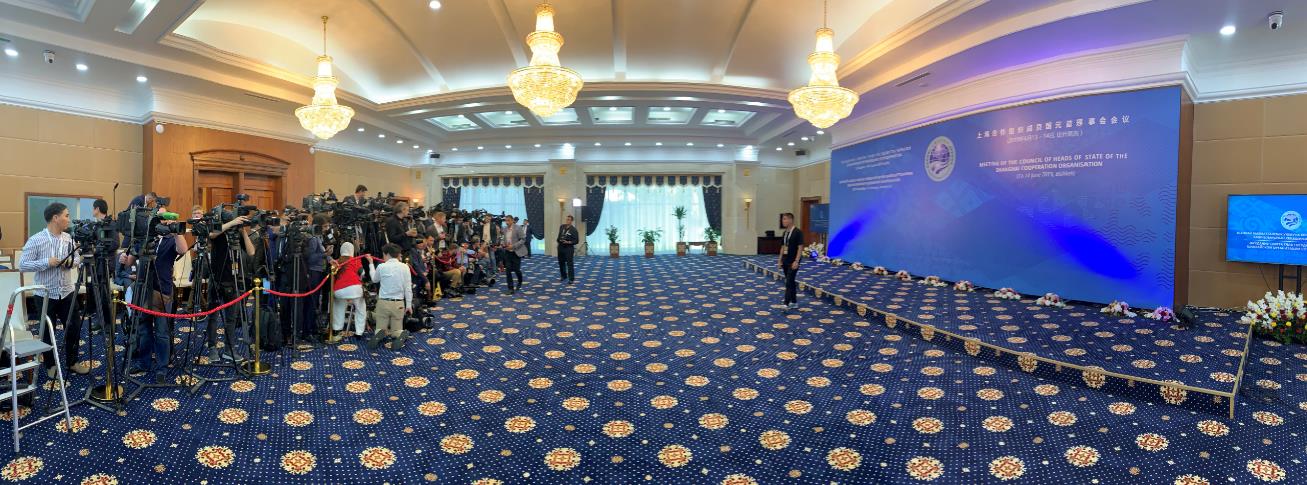 △傳統(tǒng)氈房造型的葉尼塞宮。13日中午熱恩別科夫總統(tǒng)歡迎習主席的宴會就是在這里舉行的。一天后,這里“換裝”成了上合峰會新聞中心。(央視記者張曉鵬拍攝)
