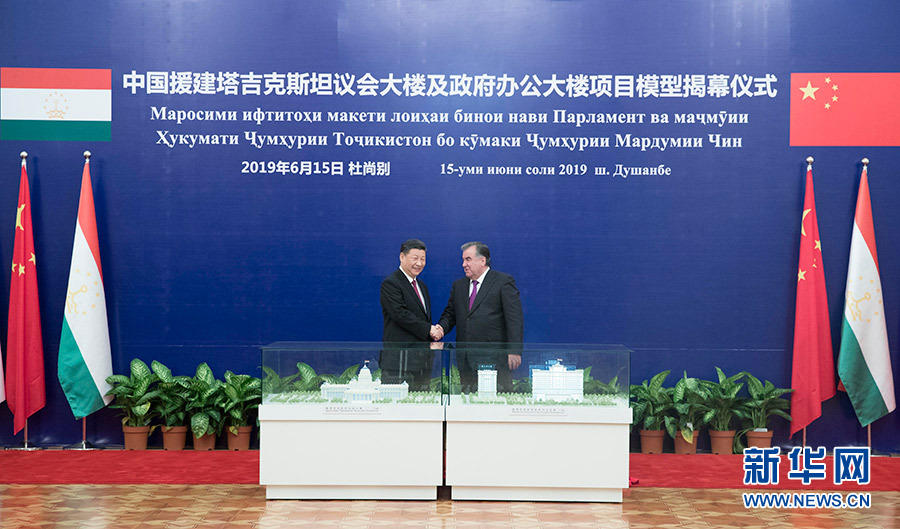 6月15日,國家主席習(xí)近平在杜尚別同塔吉克斯坦總統(tǒng)拉赫蒙會談。會談后,兩國元首共同出席中方援塔議會大樓、政府辦公大樓項(xiàng)目模型揭幕儀式。 新華社記者 王曄 攝