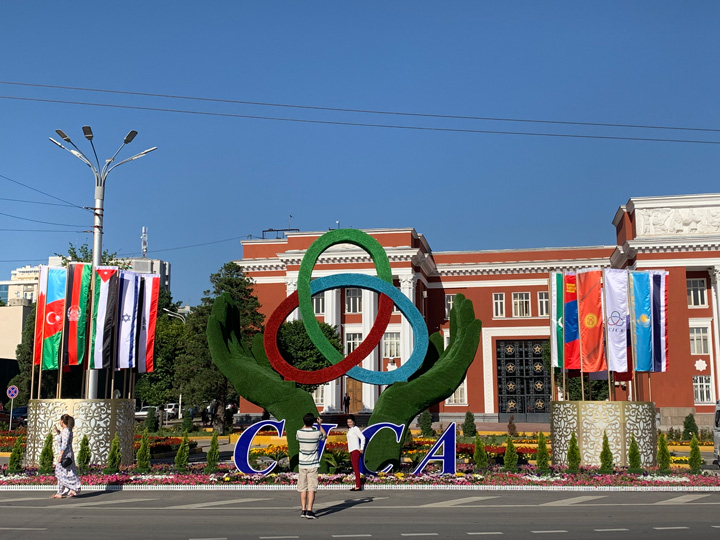 △杜尚別街頭的亞信徽標(biāo)與各國國旗。(央視記者段德文拍攝)