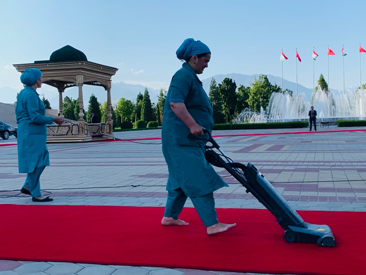 △工作人員清理總統(tǒng)府前廣場的紅地毯。(央視記者郭晗光拍攝)