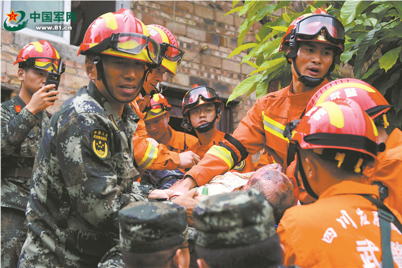 武警四川總隊(duì)宜賓支隊(duì)官兵從廢墟內(nèi)救出一名傷員。何云霄攝
