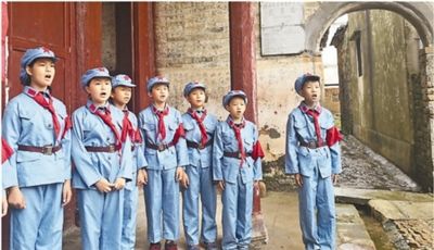 廣東南雄市油山鎮(zhèn)大塘中心小學學生在徐氏宗祠前齊唱《當紅軍歌》。人民日報記者 林小溪攝