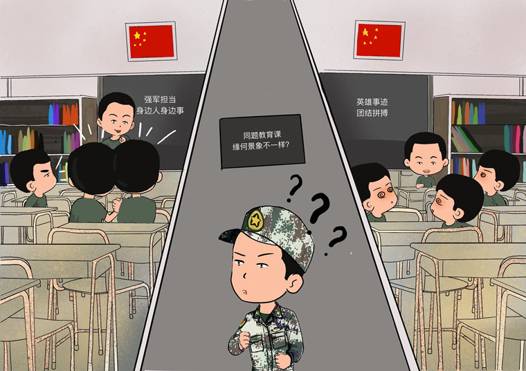 左側(cè)課室內(nèi),楊指導(dǎo)員以“從身邊人身邊事看擔(dān)當(dāng)”為牽引,將一堂教育課講得深入淺出,戰(zhàn)士們踴躍回答,氣氛熱烈;而在右側(cè)課室,同樣的教育主題,李指導(dǎo)員以單位歷史上出現(xiàn)過的英雄人物為題材,結(jié)合連隊(duì)官兵團(tuán)結(jié)拼搏奮斗經(jīng)歷,也是不遑多讓。然而不知為何,戰(zhàn)士們卻并不買賬,整個(gè)課堂死氣沉沉。