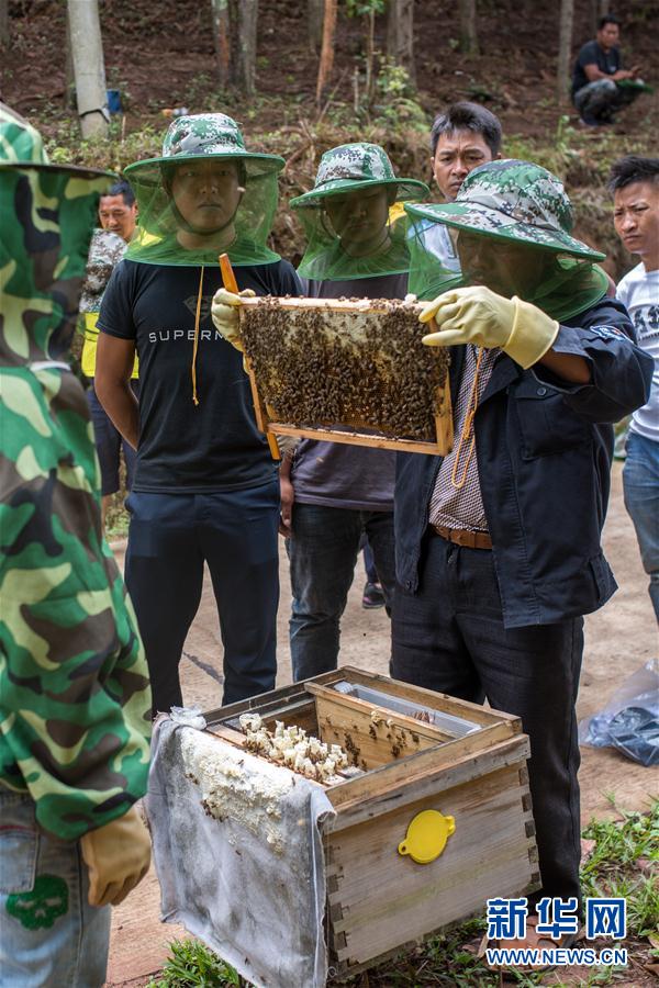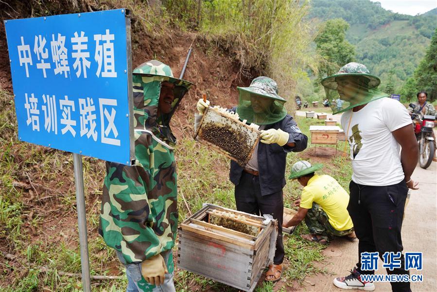 在云南省西盟縣勐梭鎮(zhèn)班母村中華蜂養(yǎng)殖基地,村民在學(xué)習(xí)養(yǎng)蜂技術(shù)(6月16日攝)。 精準(zhǔn)扶貧的春風(fēng),吹到了西南邊疆。在云南省西盟縣的拉祜山寨,人們告別了吃不飽、穿不暖、沒(méi)有安全住房的日子。學(xué)習(xí)先進(jìn)技術(shù),改變精神面貌,發(fā)展養(yǎng)蜜蜂、種甘蔗等甜蜜產(chǎn)業(yè),拉祜人的日子越過(guò)越甜。 新華社記者 秦晴 攝