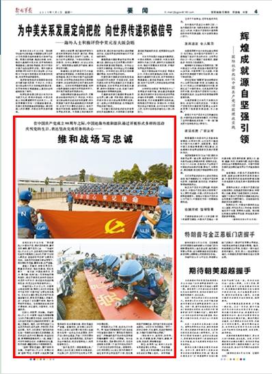 在中國(guó)共產(chǎn)黨成立98周年之際,中國(guó)赴海外維和部隊(duì)通過(guò)開(kāi)展形式多樣的活動(dòng)慶祝黨的生日,表達(dá)堅(jiān)決完成任務(wù)的決心——