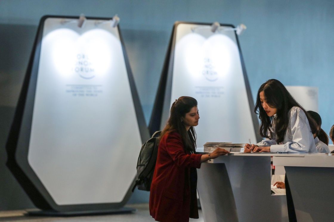 6月30日,志愿者在論壇主會場大連國際會議中心為參加論壇的外賓解答問題。新華社記者 潘昱龍 攝