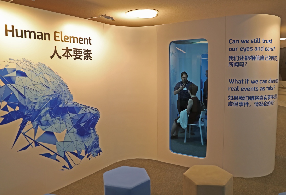 7月1日,在大連國際會議中心,參會嘉賓體驗數(shù)字化模擬技術。新華社記者 楊青 攝