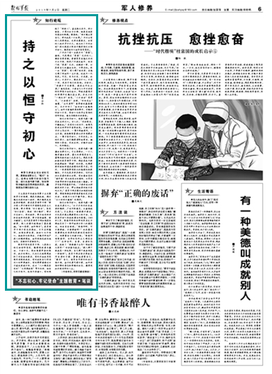 持之以恒守初心,就要永葆一顆淡泊名利之心。古人云:“淡泊明志,寧靜致遠?!睕]有內(nèi)心的安寧,就難免會在名利浮華中背離初衷。王繼才堅守開山島32年,一輩子兩袖清風(fēng)、一塵不染;老英雄張富清60多年深藏功名,一輩子堅守初心、不改本色。從他們身上,我們能夠清晰地看到,拋卻私心雜念,淡泊名利,才能守住初心,走向精彩。
