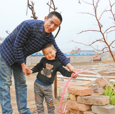 36歲的西吉縣興平鄉(xiāng)團(tuán)結(jié)村村民王五旦和兒子展示自來水。本報(bào)記者 禹麗敏攝