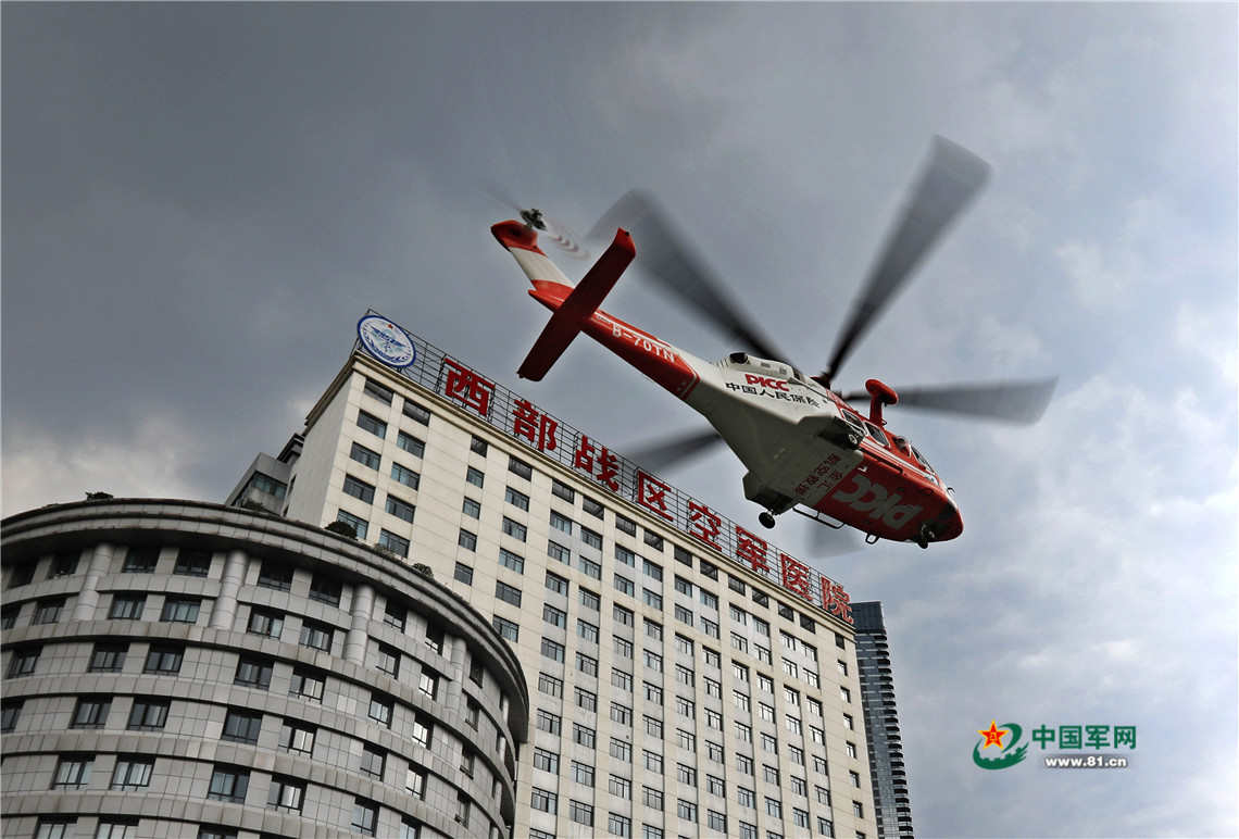 7月2日,西部戰(zhàn)區(qū)空軍組織一架通航公司救援直升機在西部戰(zhàn)區(qū)空軍醫(yī)院機降場進行起降飛行訓練。