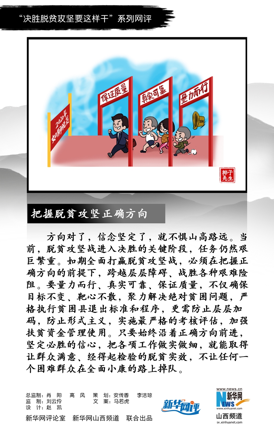 方向?qū)α?,信念堅定了,就不懼山高路遠(yuǎn)。當(dāng)前,脫貧攻堅戰(zhàn)進(jìn)入決勝的關(guān)鍵階段,任務(wù)仍然艱巨繁重。如期全面打贏脫貧攻堅戰(zhàn),必須在把握正確方向的前提下,跨越層層障礙、戰(zhàn)勝各種艱難險阻。要量力而行、真實可靠、保證質(zhì)量,不僅確保目標(biāo)不變、靶心不散,聚力解決絕對貧困問題,嚴(yán)格執(zhí)行貧困縣退出標(biāo)準(zhǔn)和程序,更需防止層層加碼,防止形式主義,實施最嚴(yán)格的考核評估,加強扶貧資金管理使用。只要始終沿著正確方向前進(jìn),堅定必勝的信心,把各項工作做實做細(xì),就能取得讓群眾滿意、經(jīng)得起檢驗的脫貧實效,不讓任何一個困難群眾在全面小康的路上掉隊。