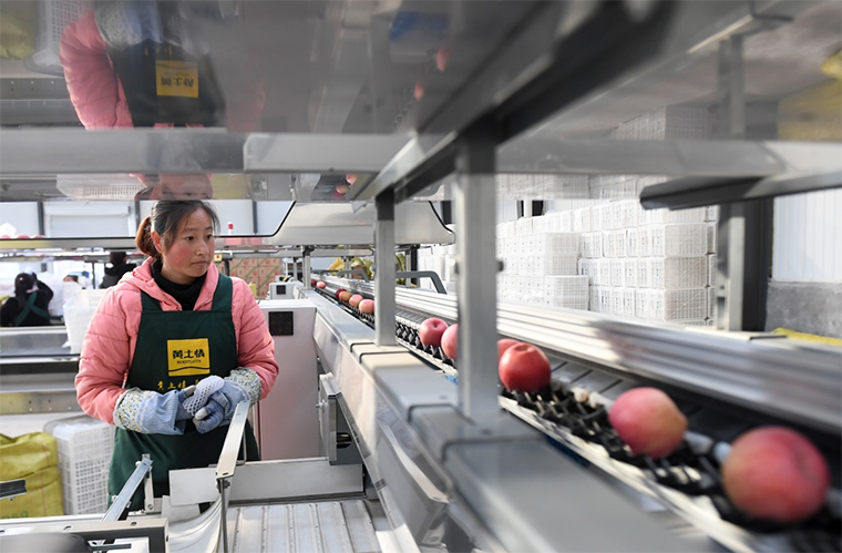 在陜西延安寶塔區(qū)一果業(yè)公司車間,工作人員等待蘋果分選后裝箱(2018年11月12日攝)。(新華社記者 劉瀟 攝)