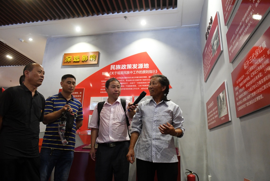 在廣西灌陽縣新圩阻擊戰(zhàn)陳列館前,故事主人公黃合林的曾孫媳婦李青鸞老人(右一)向參觀者講述保護(hù)紅旗的故事(6月28日攝)。新華社記者陸波岸 攝