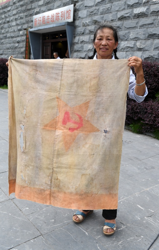 在廣西灌陽縣新圩阻擊戰(zhàn)陳列館前,故事主人公黃合林的曾孫媳婦李青鸞老人展示紅旗復制品(6月28日攝)。新華社記者陸波岸 攝