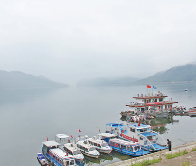 暴雨停歇,水霧升騰,江面猶如輕紗籠罩。眺望遠(yuǎn)處群山,灰蒙蒙盡失顏色,對(duì)岸巖壁上四個(gè)紅色大字更加奪目——“烏江天險(xiǎn)”。