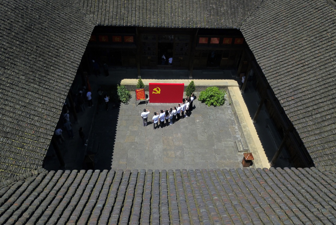 前來參觀的干部職工在貴州省甕安縣猴場會議會址里重溫入黨誓詞(7月3日無人機拍攝)。新華社記者 楊文斌 攝