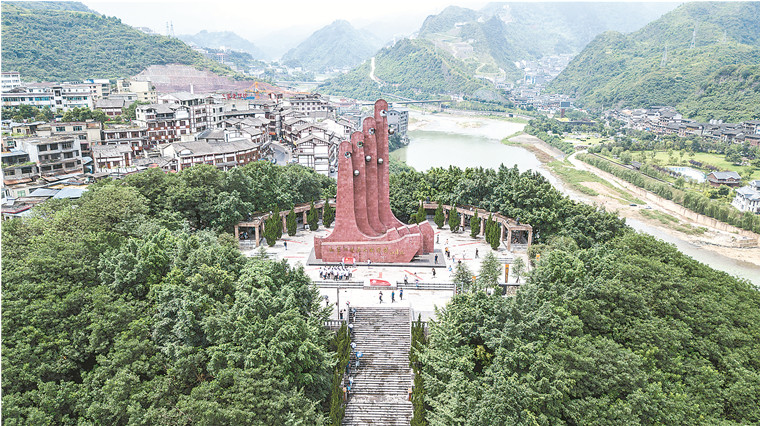 人們?cè)谌蕬咽屑t軍四渡赤水紀(jì)念園參觀(7月5日無(wú)人機(jī)拍攝)。新華社發(fā)