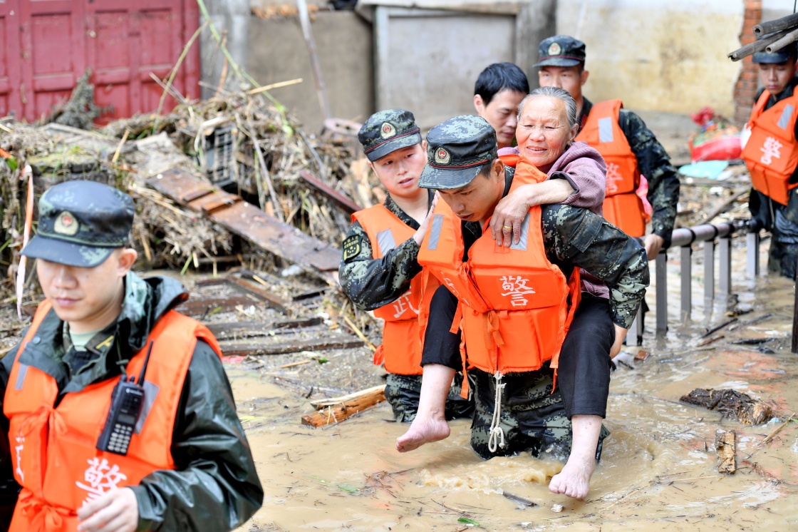 2019年5月17日,武警福建總隊(duì)三明支隊(duì)官兵在永安市小陶鎮(zhèn)老街轉(zhuǎn)移被困群眾。新華社發(fā)(李濤 攝)