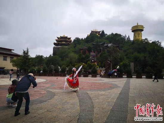 香格里拉市獨克宗古城,游客在見證紅軍與藏胞民族情誼的世界最大轉(zhuǎn)經(jīng)筒前拍照留念。中國青年報·中國青年網(wǎng)記者 孫海華 見習(xí)記者 陳垠杉/攝