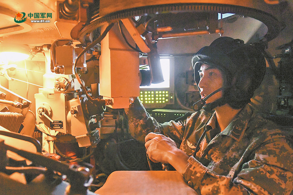 在夜間實彈戰(zhàn)術(shù)考核中,步戰(zhàn)車車長快速做好戰(zhàn)斗準備。