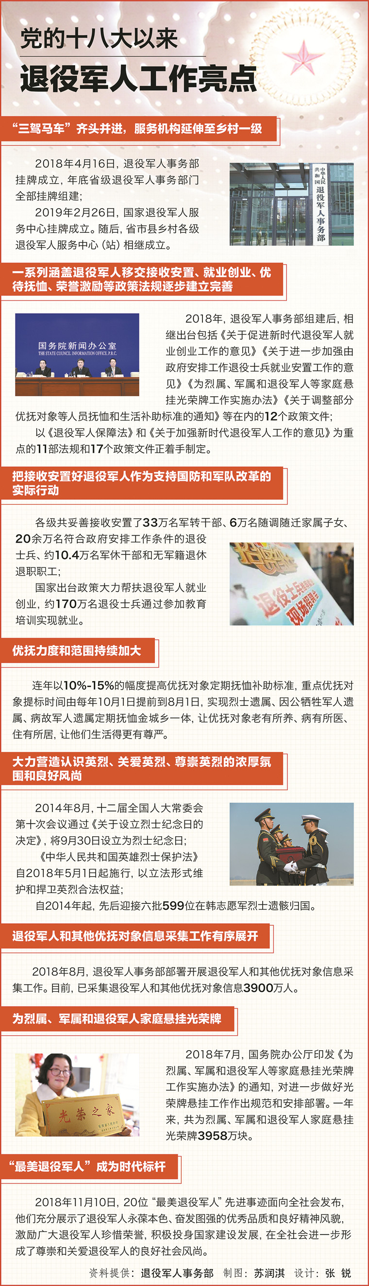 與《退役軍人保障法》相配套的《退役軍人安置條例》《軍人撫恤優(yōu)待條例》《烈士褒揚條例》等,也將在2019年制定修訂。