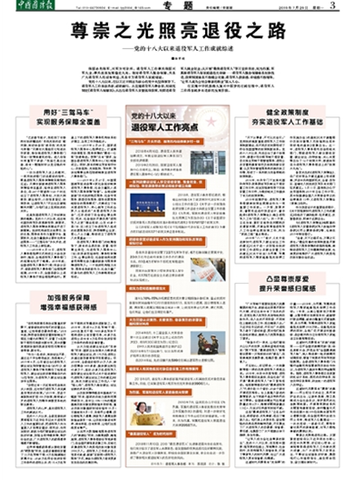 2016年,中央專門下發(fā)深化國防和軍隊改革期間軍隊轉(zhuǎn)業(yè)干部安置工作文件,印發(fā)加強新形勢下優(yōu)撫安置工作文件,為做好相關(guān)工作提供了有力的政策保障。