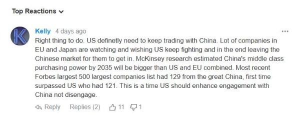 美國網友也對此消息評論稱:“這是正確的做法。美國絕對需要繼續(xù)與中國進行貿易。麥肯錫(McKinsey)的研究估計,到2035年,中國中產階層的購買力將超過美國和歐盟的總和?!陡2妓埂纷钚碌娜?00強企業(yè)排行榜顯示,中國有129家企業(yè)上榜,首次超過美國的121家。在這個時候,美國應該加強與中國的接觸,而不是與中國脫鉤?!?/p>