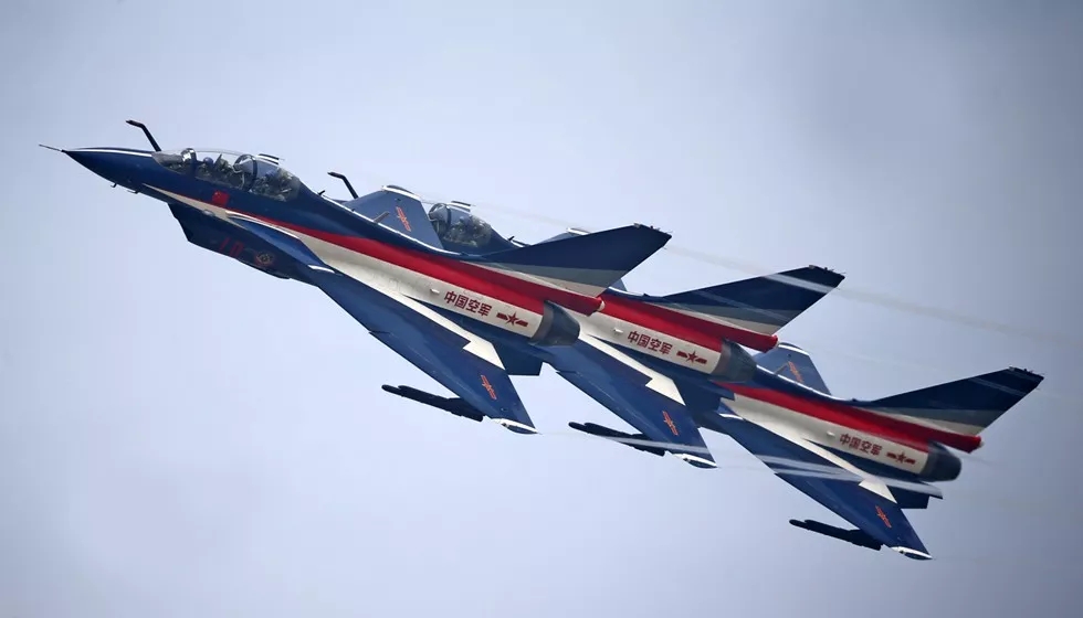 空軍八一飛行表演隊飛行員駕駛飛機沖上云霄。單機大仰角上升、雙機剪刀機動、四機編隊橫滾……一系列高難度飛行表演動作在藍天輪番上演。