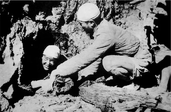 張思德(左)和戰(zhàn)友一起燒炭。1944年9月5日,張思德燒炭時(shí)因炭窯崩塌而犧牲。