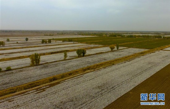 這是無人機拍攝的新疆生產(chǎn)建設(shè)兵團第一師的一處棉田(2016年10月23日攝)。 新華社記者 趙戈 攝