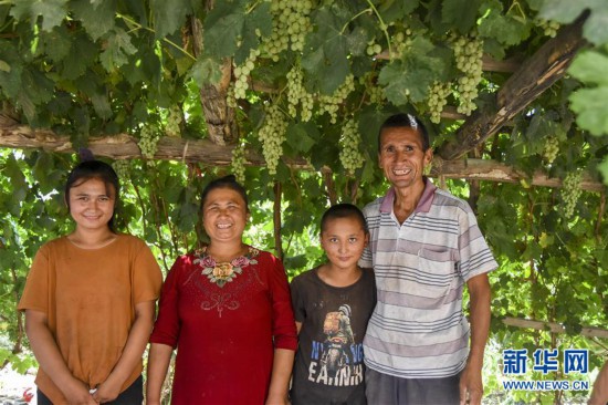 新疆生產(chǎn)建設(shè)兵團第三師圖木舒克市51團4連貧困戶依馬木·哈力克(右一)和家人在自家葡萄棚下(8月4日攝)。 新華社記者 潘瑩 攝