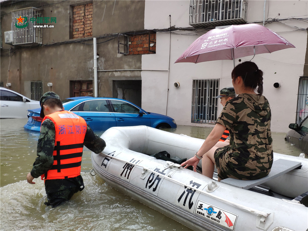 圖為武警臺(tái)州支隊(duì)官兵轉(zhuǎn)移臨海市永豐鎮(zhèn)受內(nèi)澇圍困的群眾。