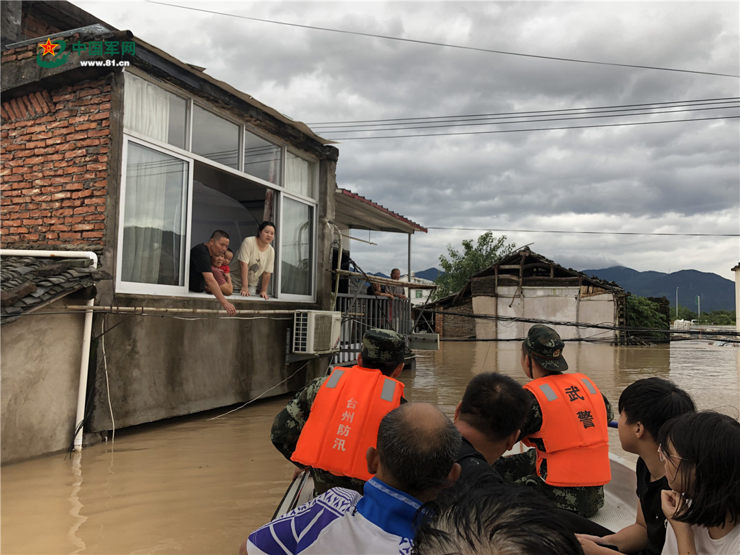 圖為武警臺(tái)州支隊(duì)官兵轉(zhuǎn)移臨海市永豐鎮(zhèn)受內(nèi)澇圍困的群眾。